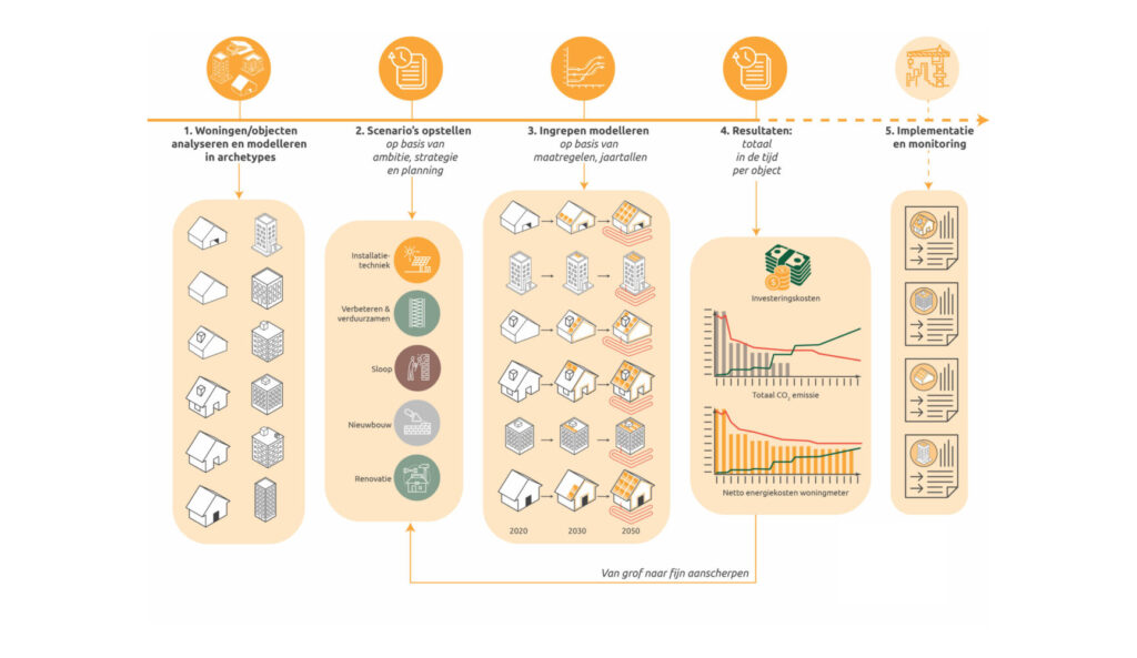 “We hebben principe-scenario’s voor ze gemaakt. Hiermee kun je bijvoorbeeld zien wat isoleren, zonnepanelen plaatsen en gasloos maken van woningen in verschillende combinaties oplevert aan uitstootreductie. Zij kunnen zelf met die scenario’s gaan samenstellen wat ze willen doen. We hebben ze een waaier van mogelijkheden gegeven”, aldus Boudewijn Elsinga, W/E adviseurs.